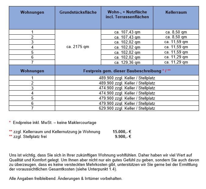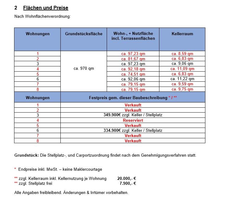 Es entstehen 8 Eigentumswohnungen mit einer Wohnfläche von 75 - 98qm. Dazu gehören auch 2 Penthouse-Wohnungen mit eigener, nicht-einsehbarer Dachterrasse (Loggia). Das Mehrfamilienhaus verfügt über ein umfangreiches Leistungspaket inkl. Keller, Aufzug, Luft-Wärme-Pumpe, Lüftungsanlage, Fußbodenheizung und vielem mehr.